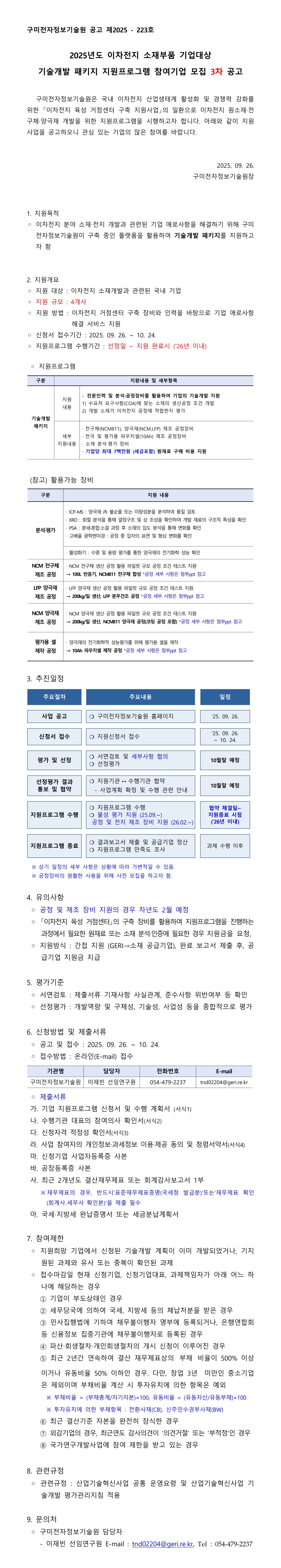 2025년도 이차전지 소재부품 기업대상 기술개발 패키지 지원프로그램 참여기업 모집 3차 공고
