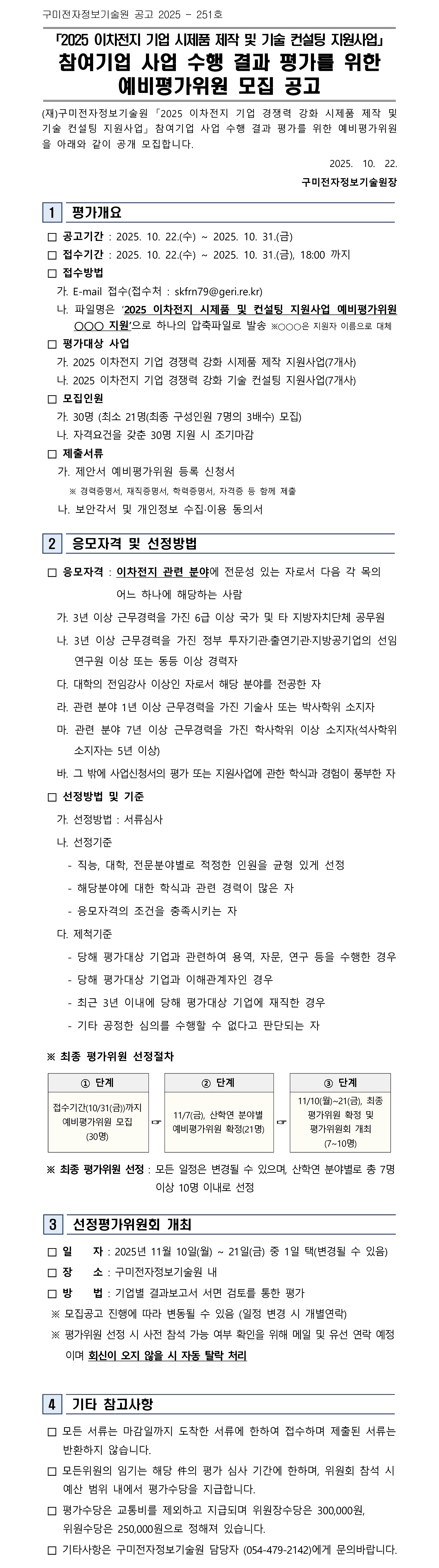 「2025 이차전지 기업 시제품 제작 및 기술 컨설팅 지원사업」 참여기업 사업 수행 결과 평가를 위한 예비평가위원 모집 공고
