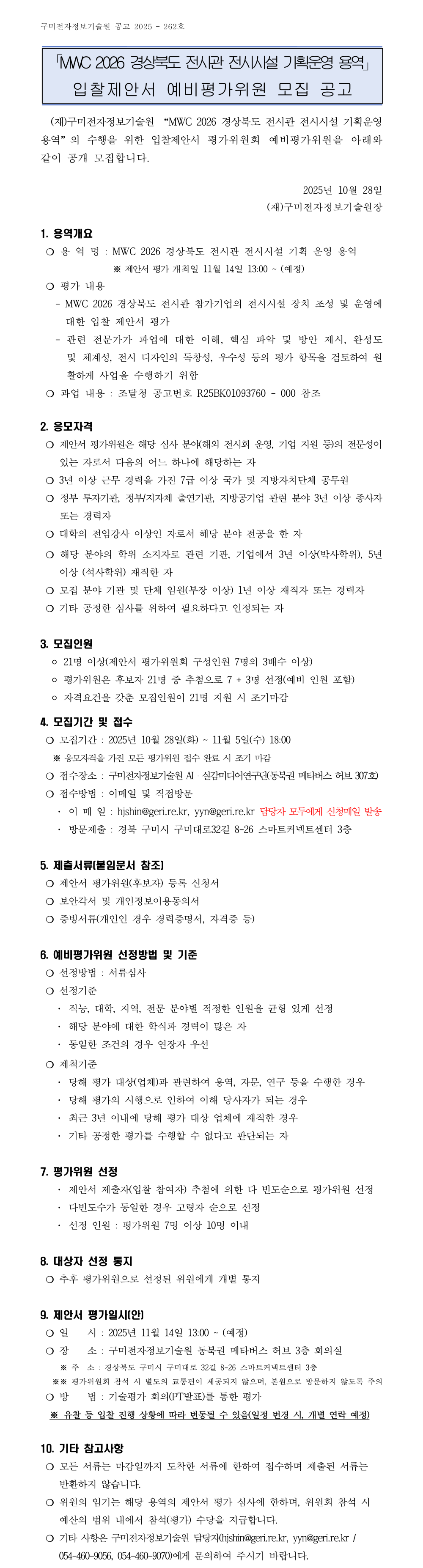 MWC 2026 경상북도 전시관 전시시설 기획운영 용역 입찰제안서 예비평가위원 모집 공고