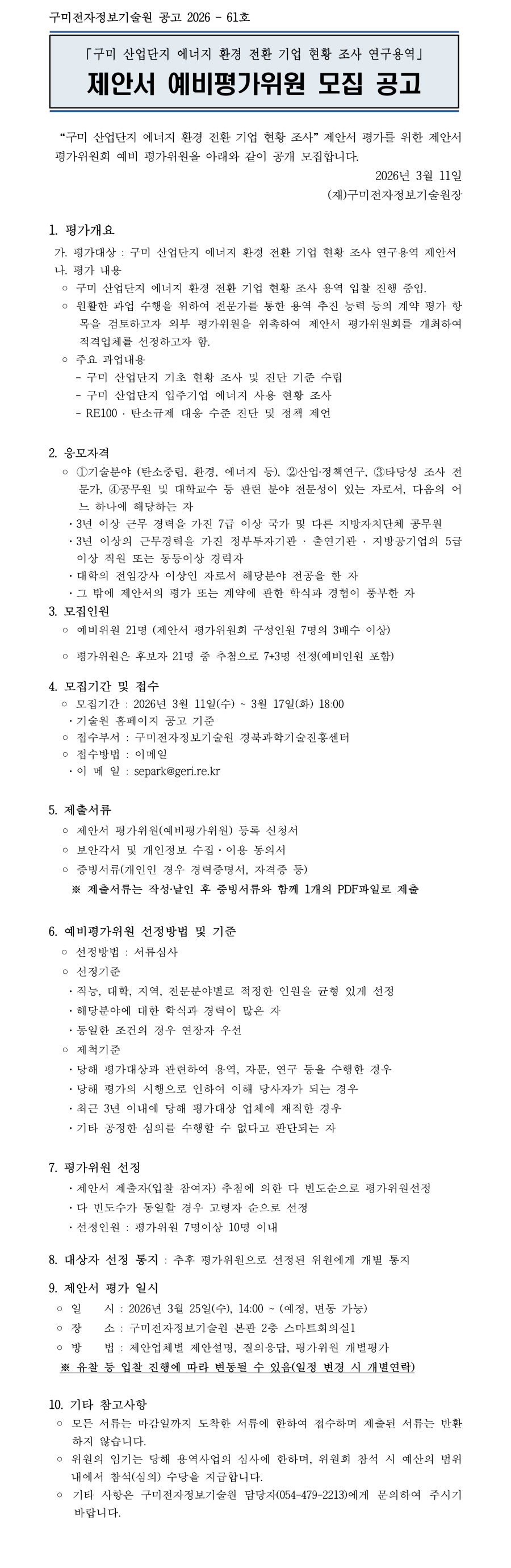 「구미 산업단지 에너지 환경 전환 기업 현황 조사 연구용역」 제안서 예비평가위원 모집 공고