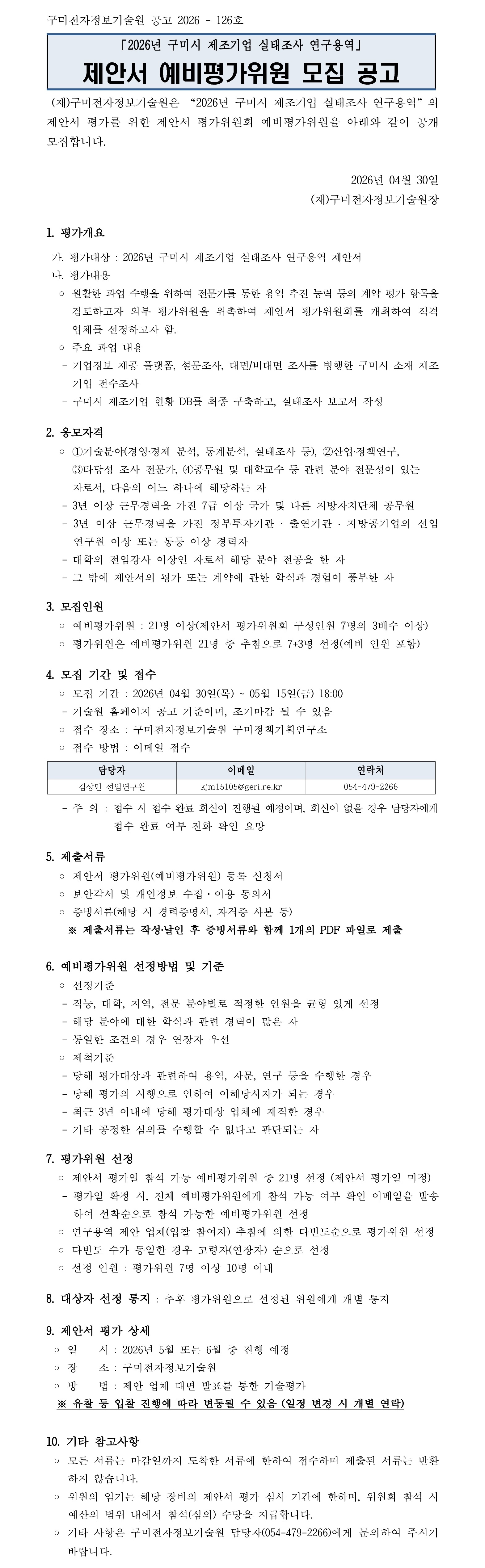 「2026년 구미시 제조기업 실태조사 연구용역」 제안서 예비평가위원 모집 공고