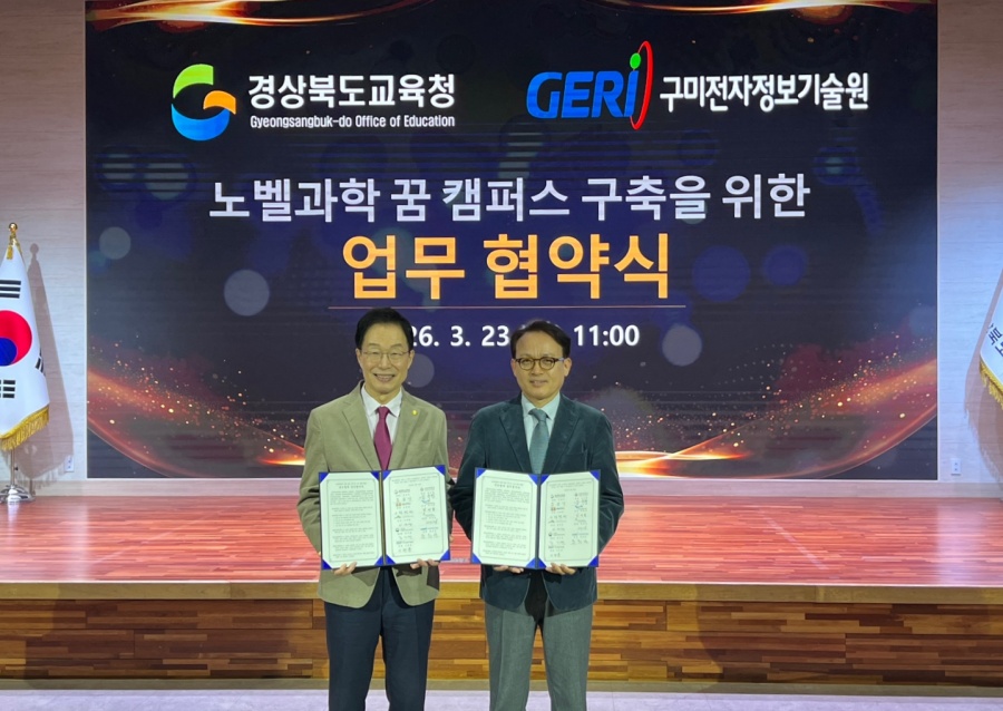 3월 23일(월), 구미전자정보기술원(이하 GERI)은 ‘노벨과학 꿈 캠퍼스’ 구축을 위한 업무협약(MOU)을 체결했습니다.
