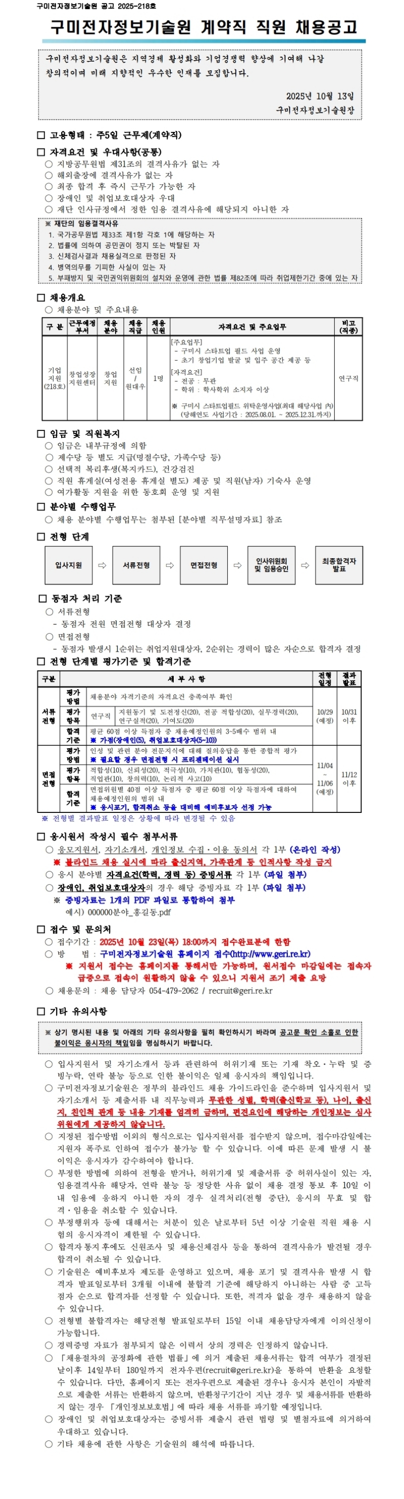 [채용공고] 2025-218호 구미전자정보기술원 창업성장지원센터 계약직 직원채용 공고