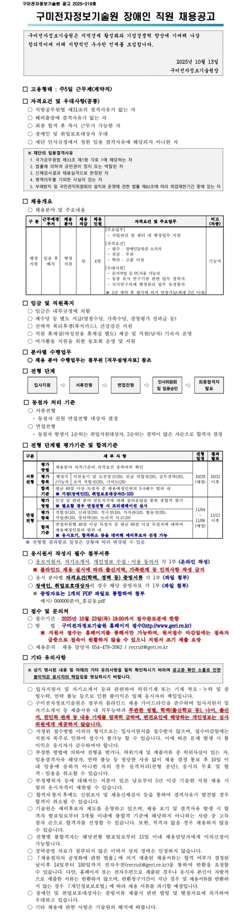 [채용공고] 2025-219호 구미전자정보기술원 장애인 직원채용 공고