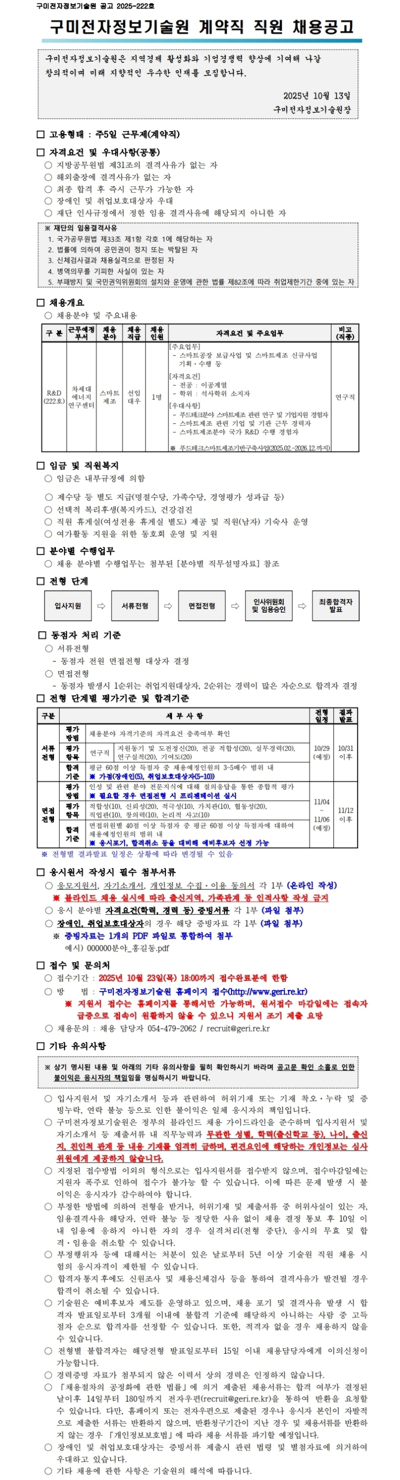 [채용공고] 2025-222호 구미전자정보기술원 계약직 직원채용 공고(2025-104호 재공고)